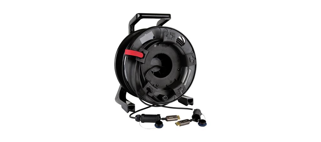 - Сверхвысокая надежность — интегрированная защита оптических волокон – гофрированная трубка из нержавеющей стали, усиленная кевларом. Прочная оболочка, усиленные корпуса разъемов и надежные влагозащищенные ударопрочные защитные кожухи для разъемов обеспечивают высокую устойчивость кабеля к растяжению и сдавливанию. При эксплуатации кабель сматывается с прочной переносной пластиковой бобины, входящей в комплект
