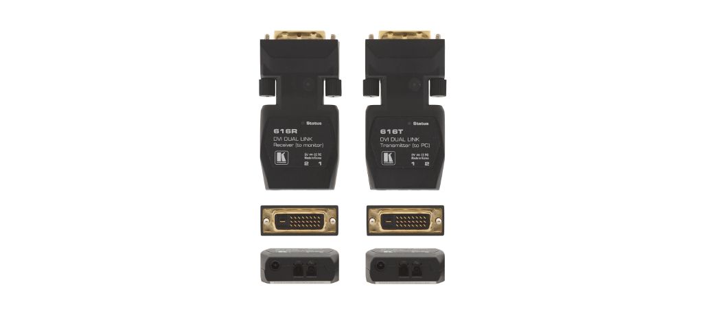 616T и 616R - пара из малогабаритных и легких съемных волоконно-оптических передатчика и приемника. Приборы дают возможность передавать двухканальный несжатый сигнал DVI с разрешением до WQXGA (2560x1600, 60 Гц) или WQUXGA (3840x2400, 33 Гц) на расстояние до 500 м по дуплексному многомодовому волоконно-оптическому кабелю с двумя разъемами LC. 616T преобразует сигнал DVI в оптический сигнал, который передает на приемник 616R, а 616R декодирует оптический сигнал, выдавая восстановленный сигнал DVI.